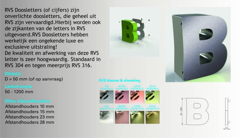 RVS Doosletters en RVS Dooscijfers zijn onverlichte doosletters, die geheel uit RVS zijn vervaardigd. Hierbij worden ook de zijkanten van de letters in RVS uitgevoerd.